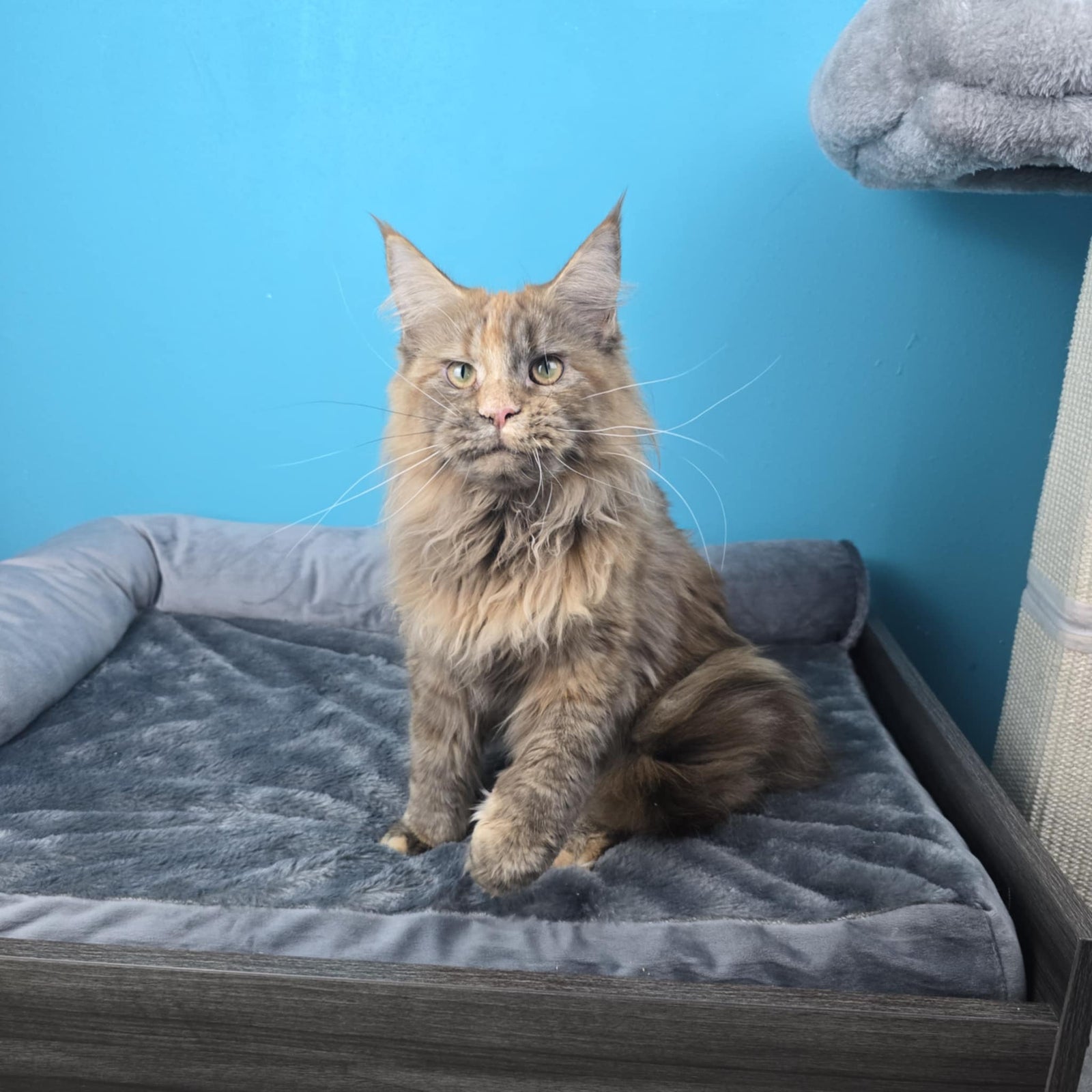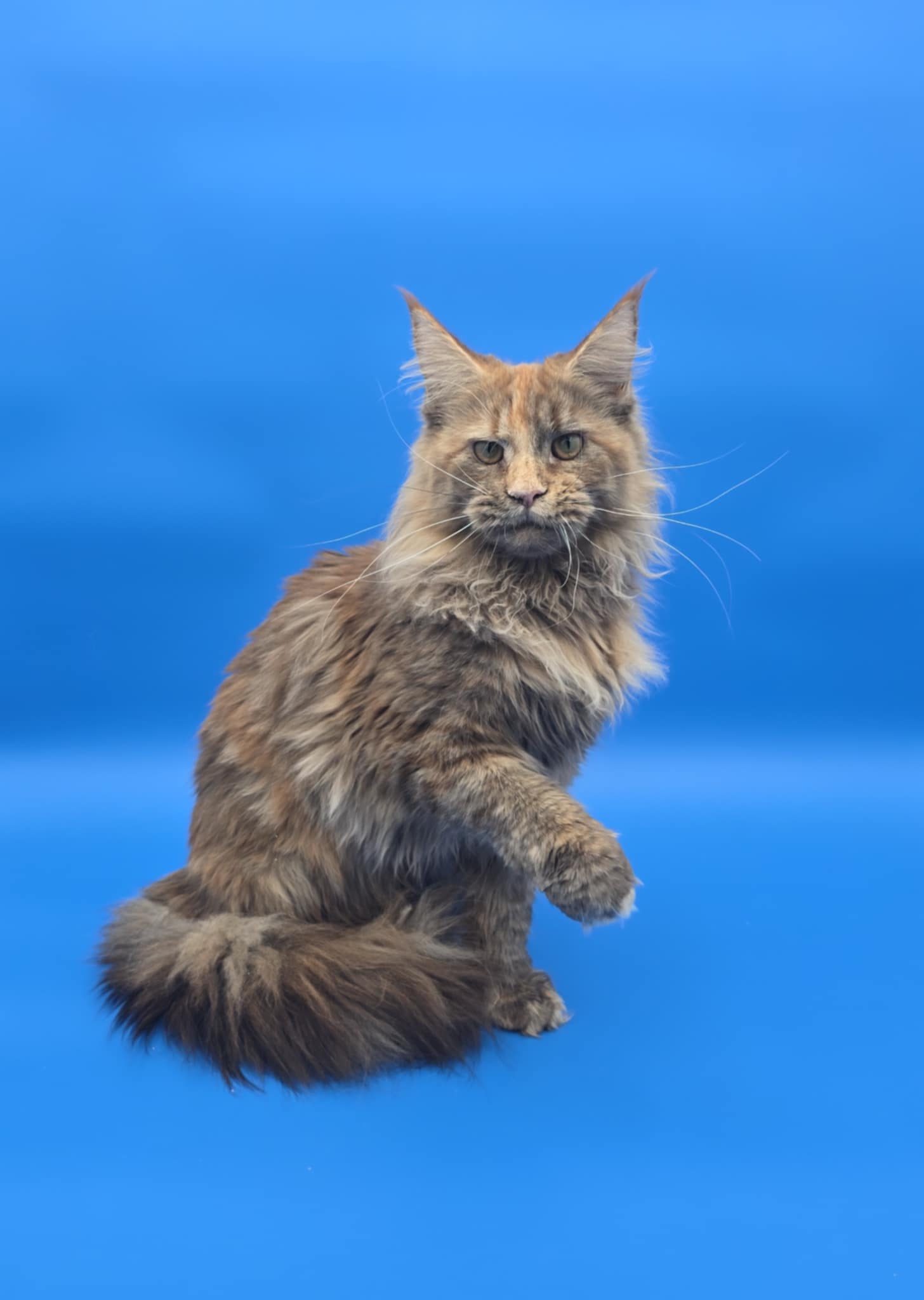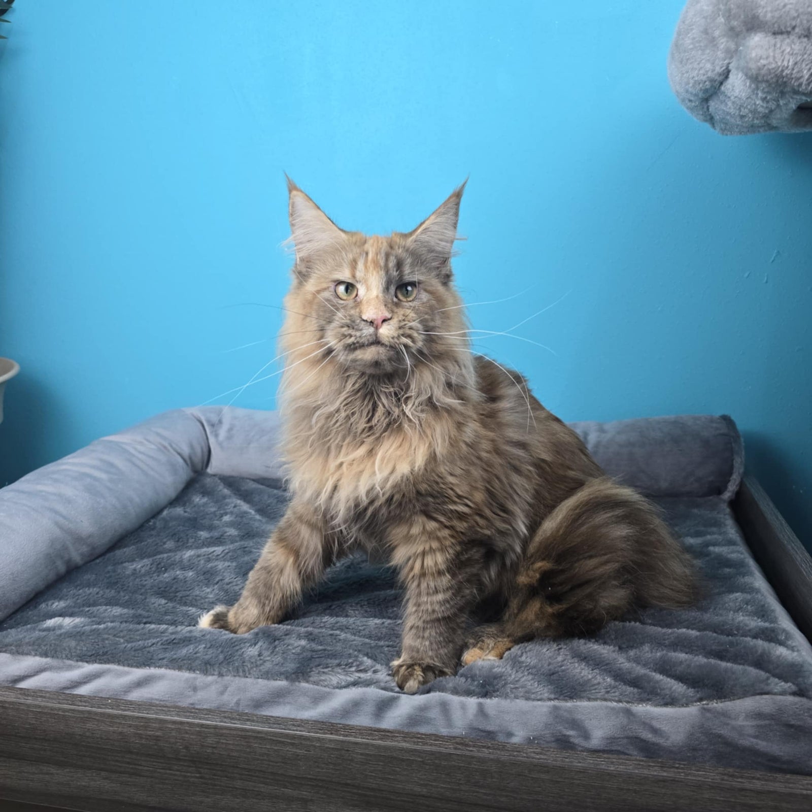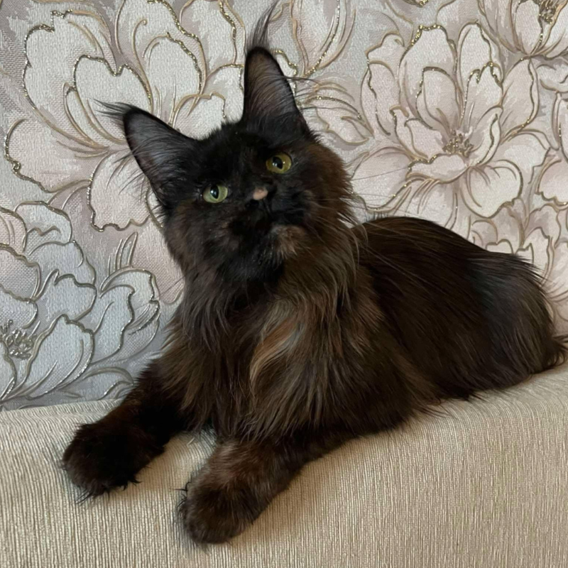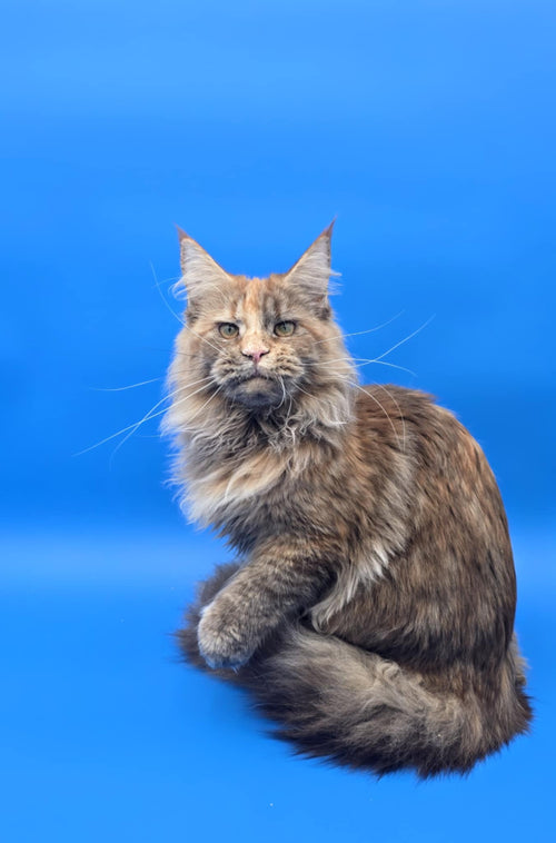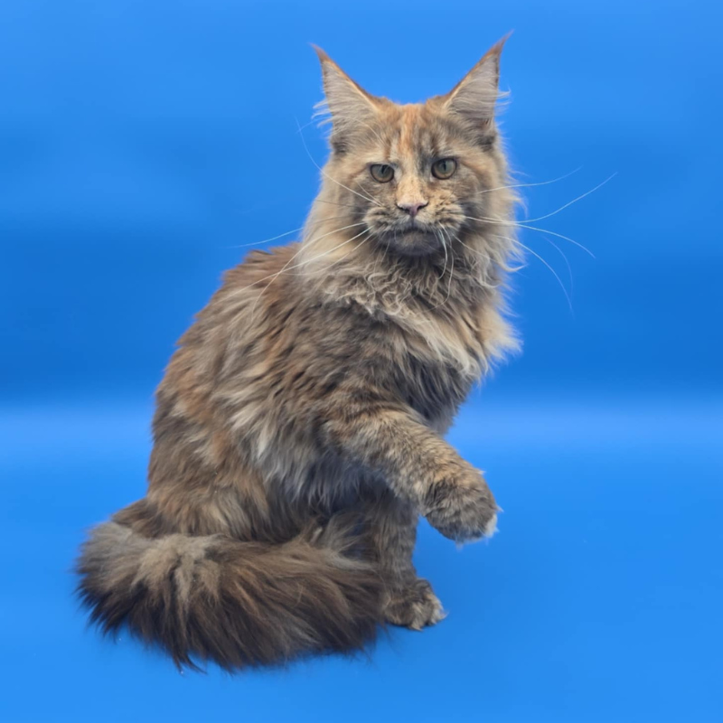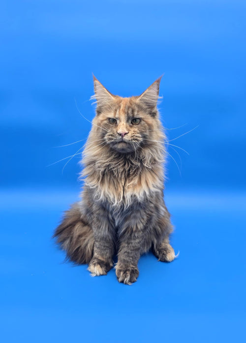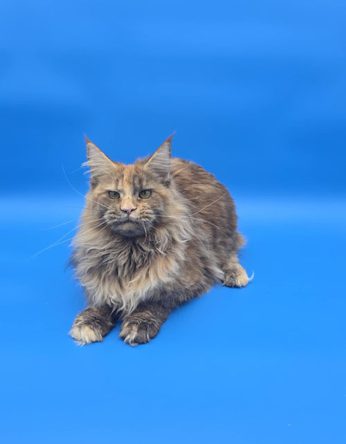 Queen Amelia was imported from Russia. She's a rare Phoenix Tortie color. Her papered name is Ameila Lions Paradise of NWCoonies. She was born on May 28th, 2024.