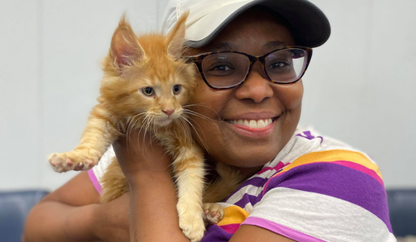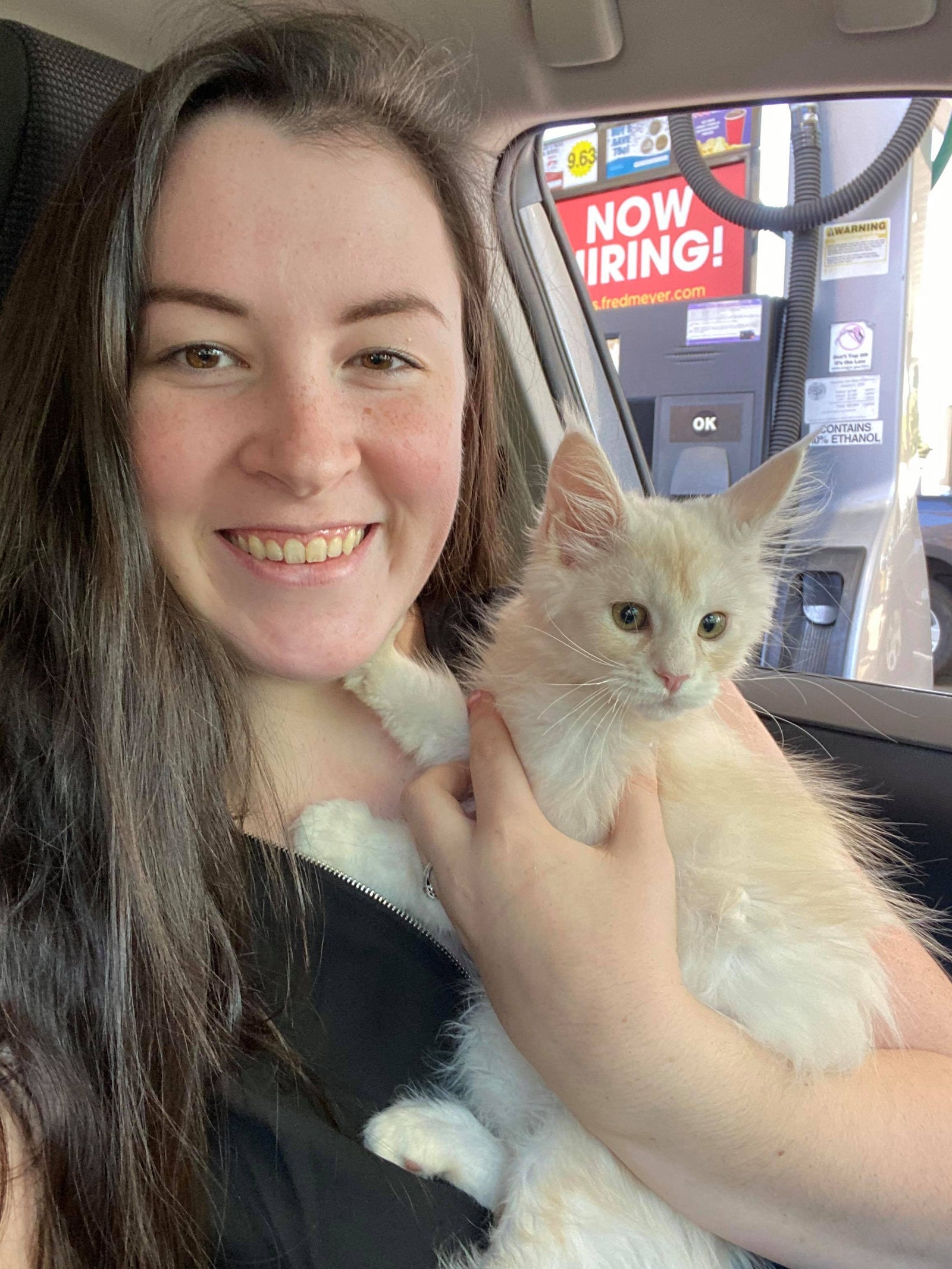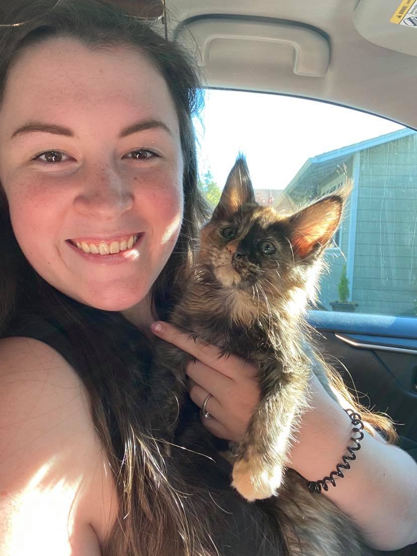 Your kitten can fly to you using Alaska Airlines pet service cargo program to be picked up at your local airport. This includes airfare, crate, vet checkup, required shots, and a health certificate for $650 out of PDX or $950 out of SEA.