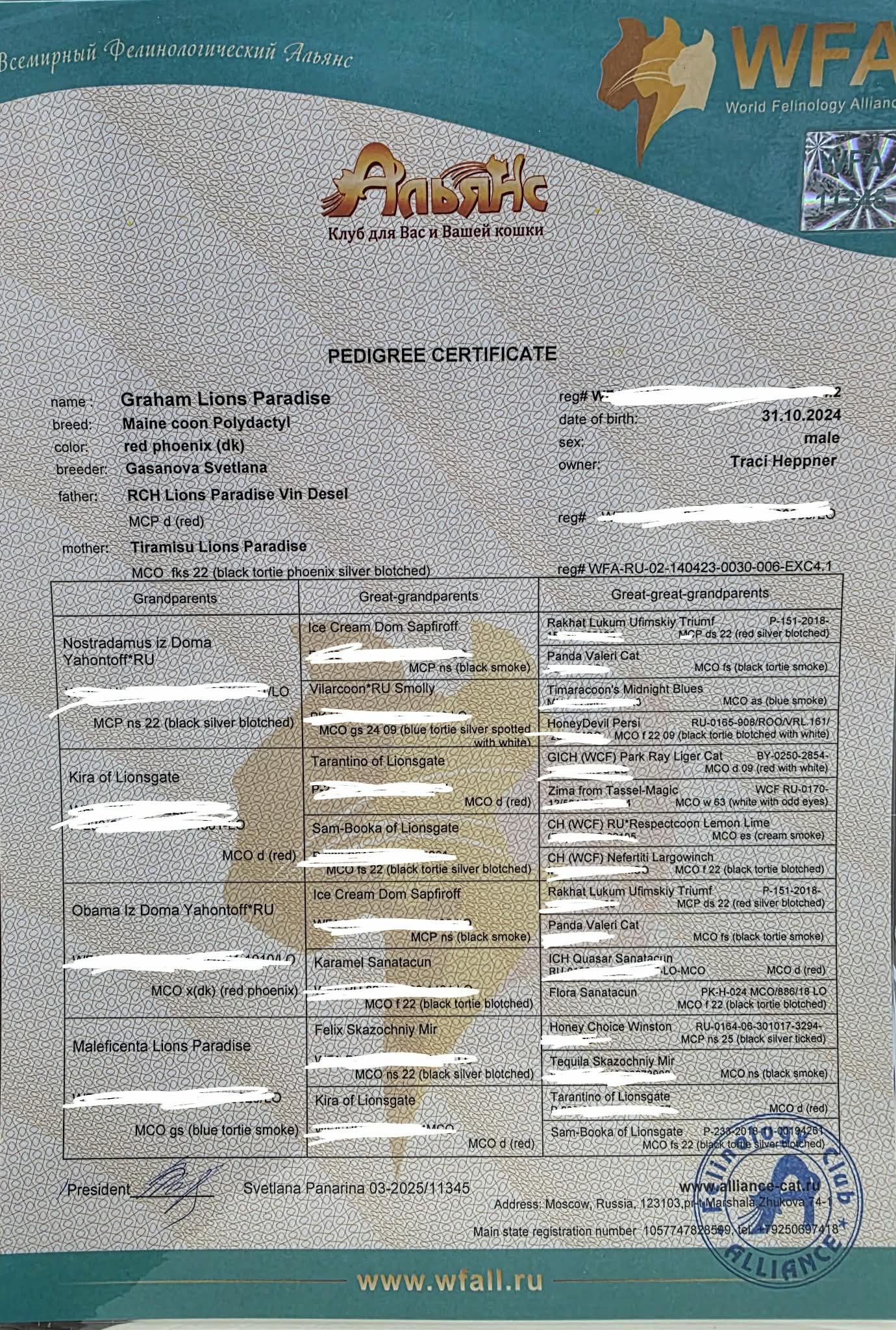 King Hershey was imported from Russia. His birthdate is October 31st, 2024. He's a Phoenix polydactyl. His papered name is Graham Lions Paradise of NWCoonies.