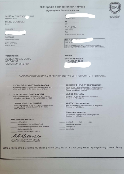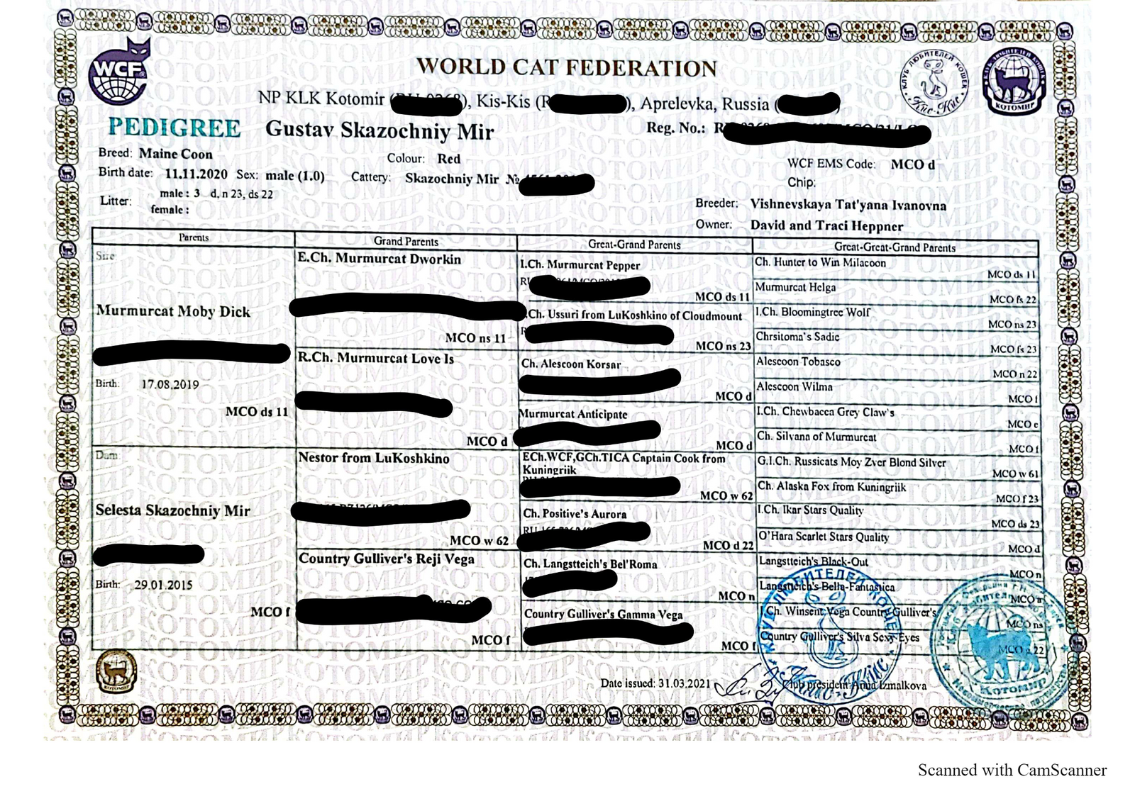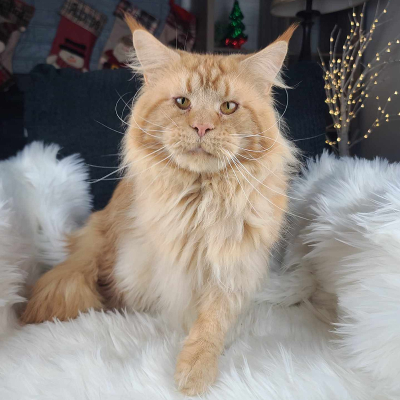King Knut, pronounced "Kah-nute" from the Vikings show, came to us from Russia. His papered name is Gustav Skazochiny Mir. We actually share a birthday! 11/11! His DOB is 11/11/2020. He's an affectionate boy with a great fluffy coat and an awesome distinctive face. His pronounced muzzle is what really makes him stand out. He's our big red "Garfield".
