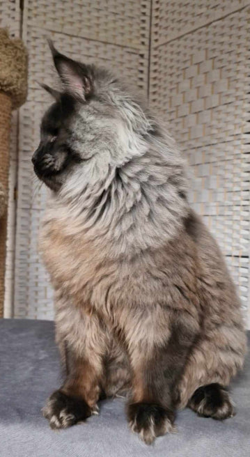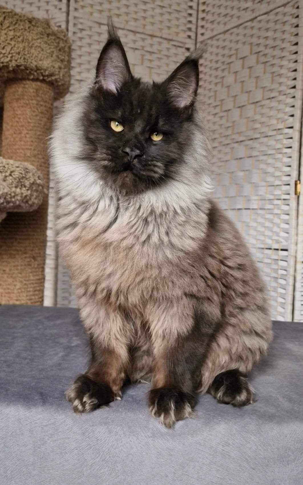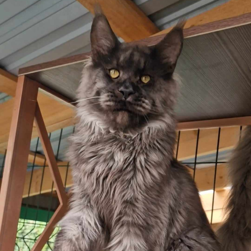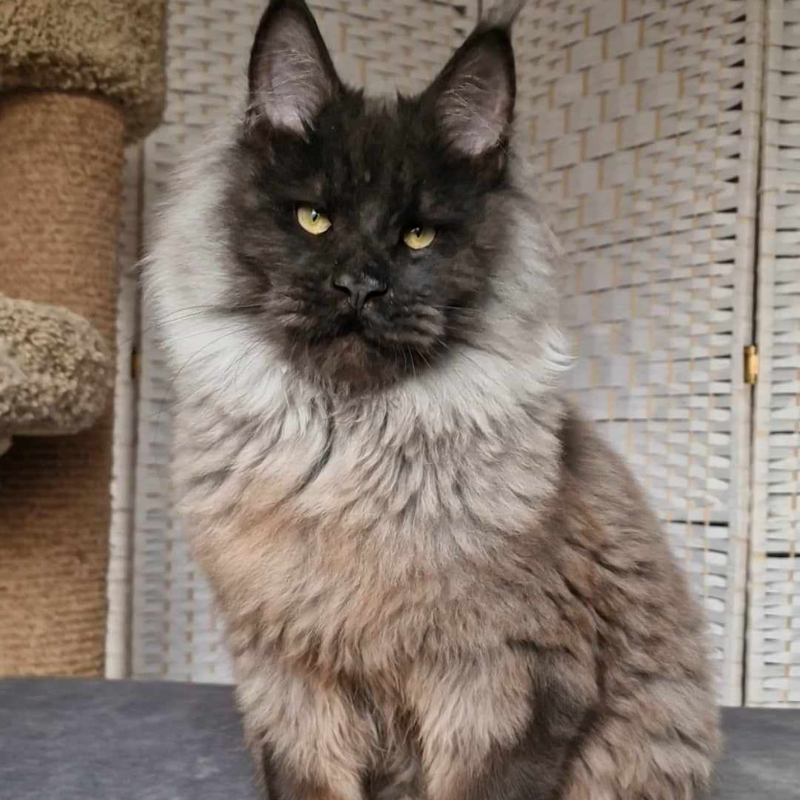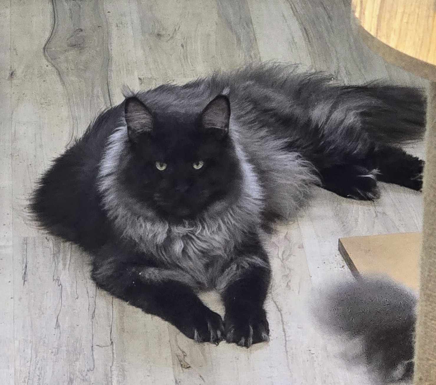 King Rollo was imported from Russia. His papered name is Alan Kun Wizard and his DOB is 6/18/2023. He's such a gorgous black smoke boy. He's still very young, so we likely won't see kittens from him until late 2024 or early 2025.