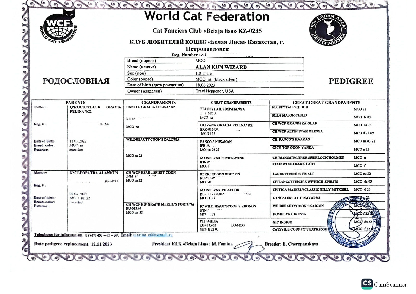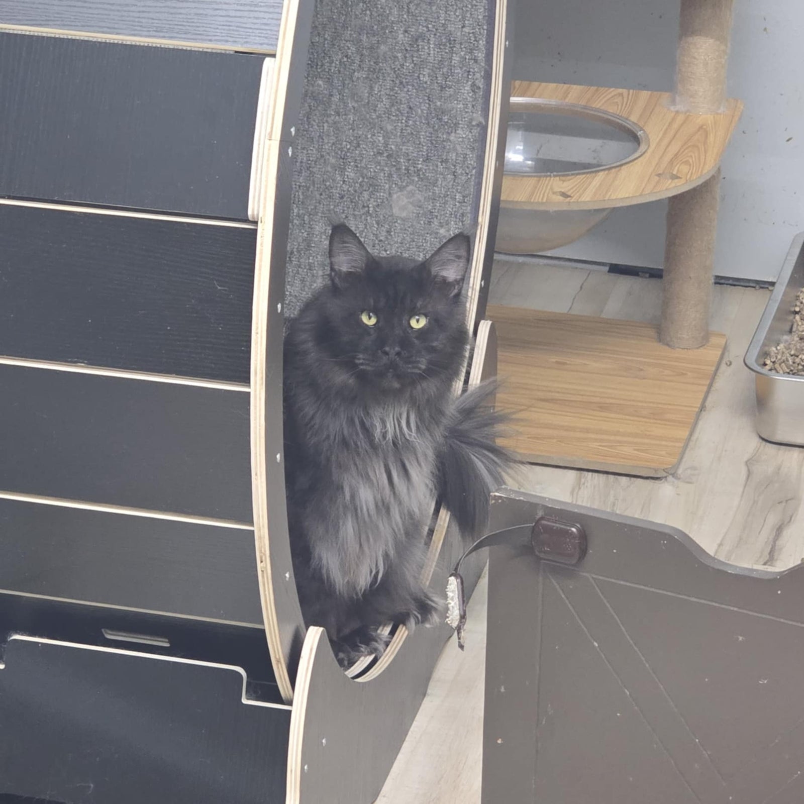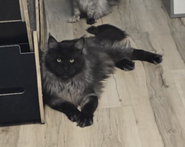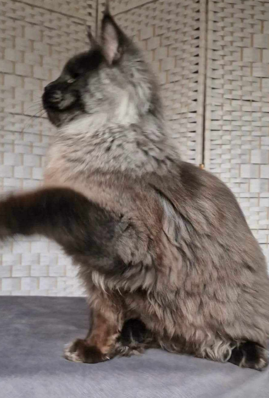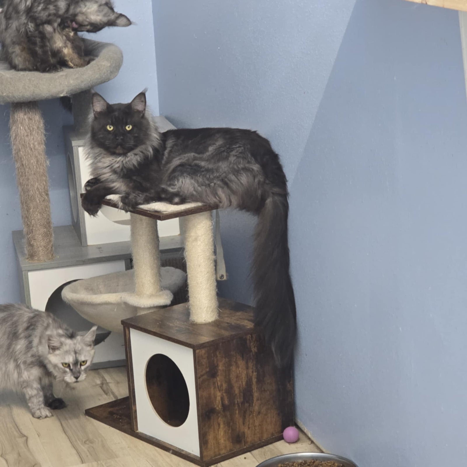 King Rollo was imported from Russia. His papered name is Alan Kun Wizard and his DOB is 6/18/2023. He's such a gorgous black smoke boy. He's still very young, so we likely won't see kittens from him until late 2024 or early 2025.