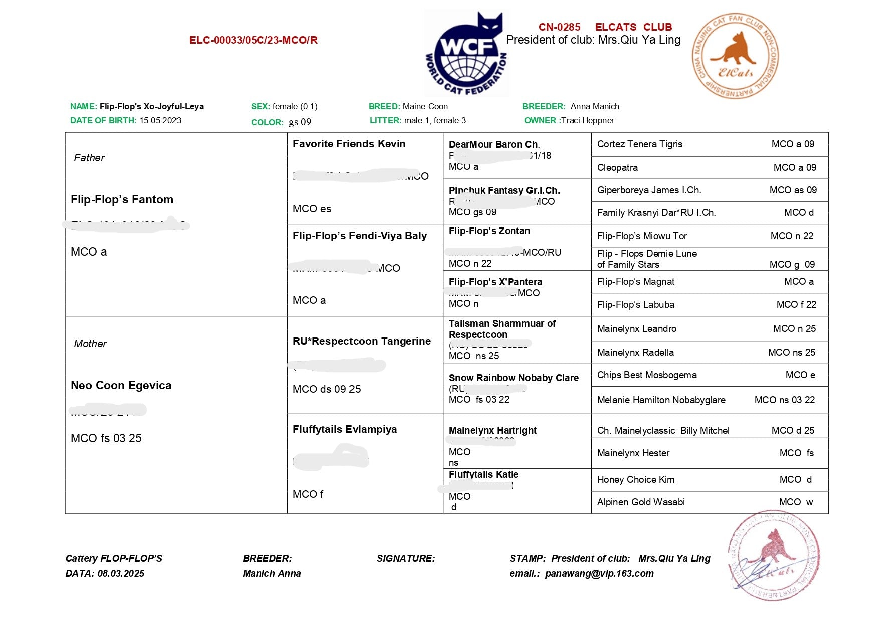 Queen Leya was imported from Russia. Her birthdate is May 15th, 2023. She's a Blue tortie. Her papered name is Flip-Flop's Xo-Joyful-Leya.