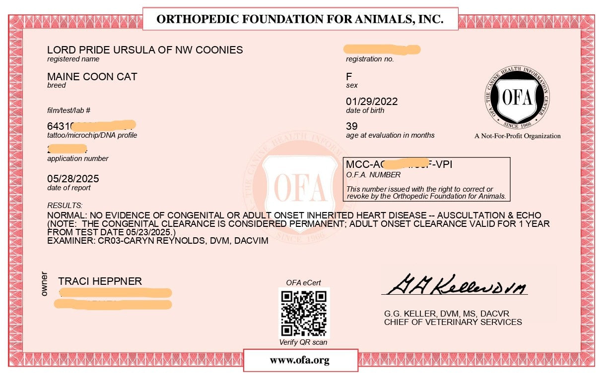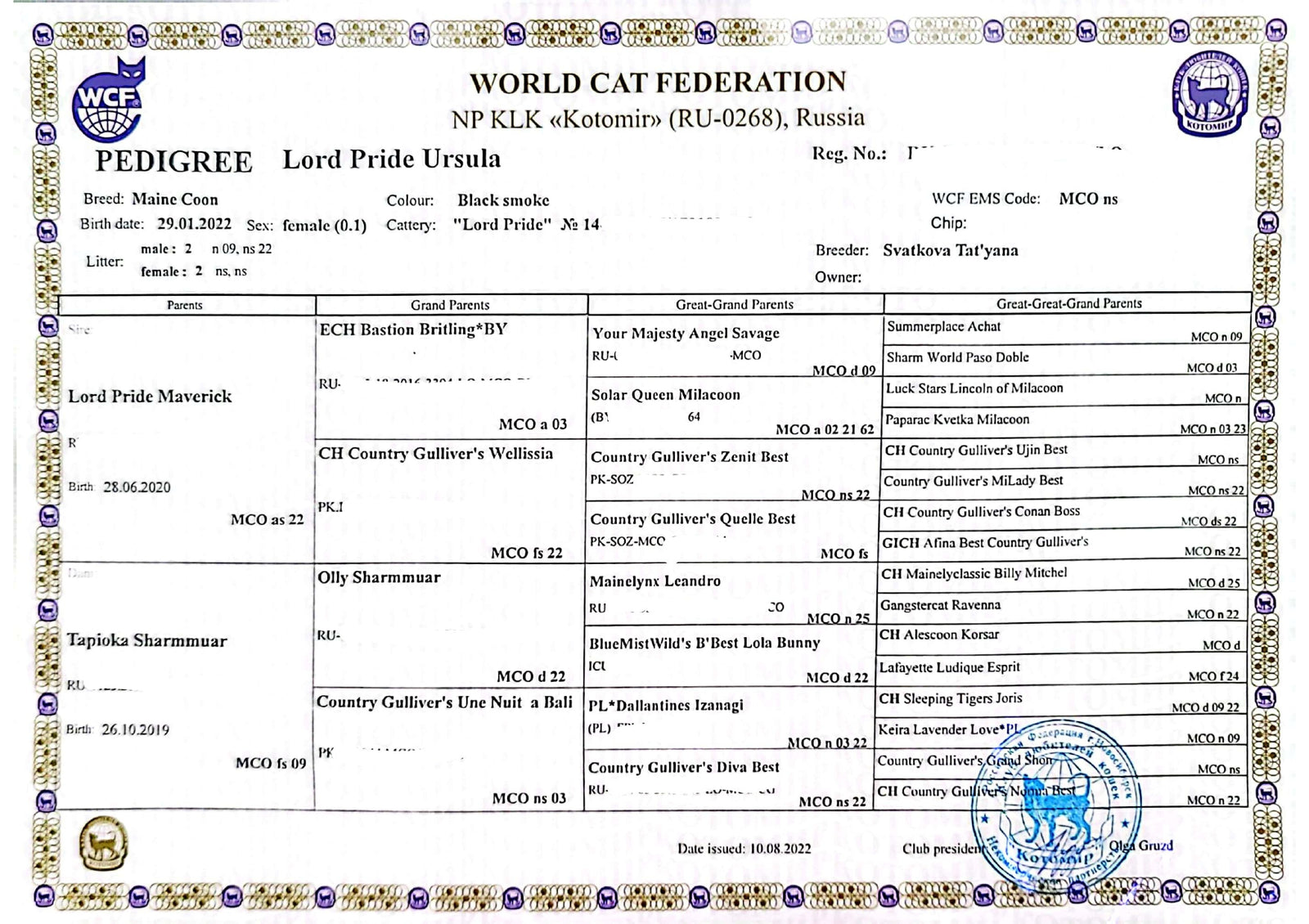 Ursula was imported from Russia. She was born on 1/29/2022. Her papered name is Ursula Lord Pride. She's a black smoke. She's got an amazing coat and is such a big girl! We just love her to pieces!