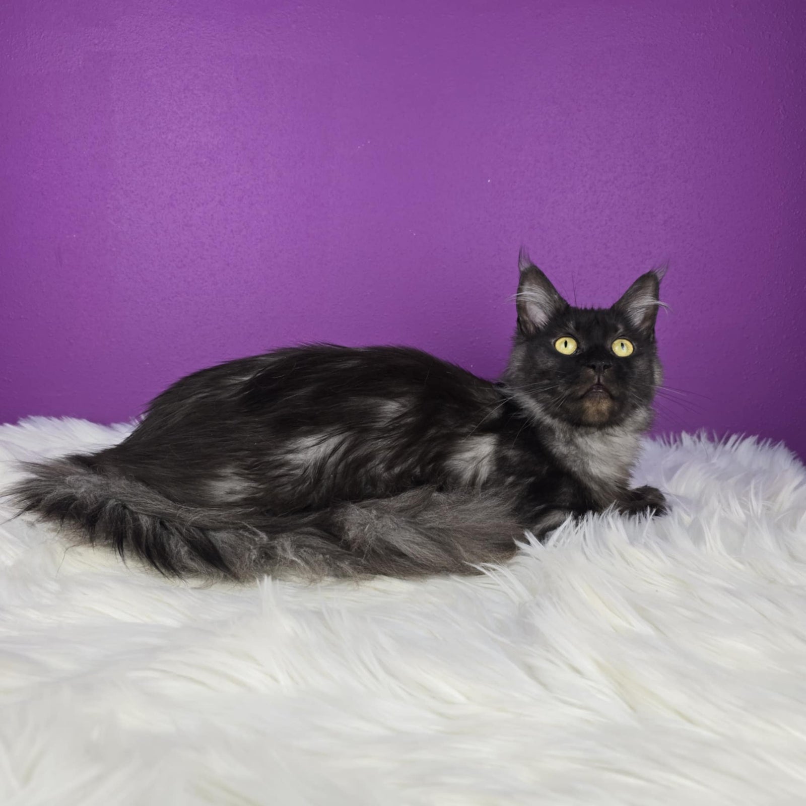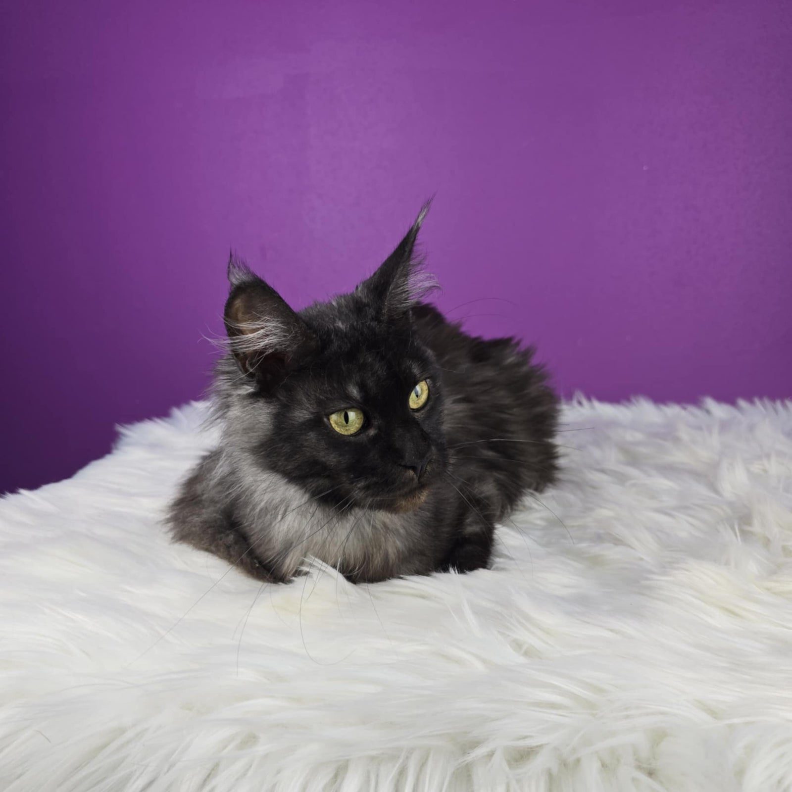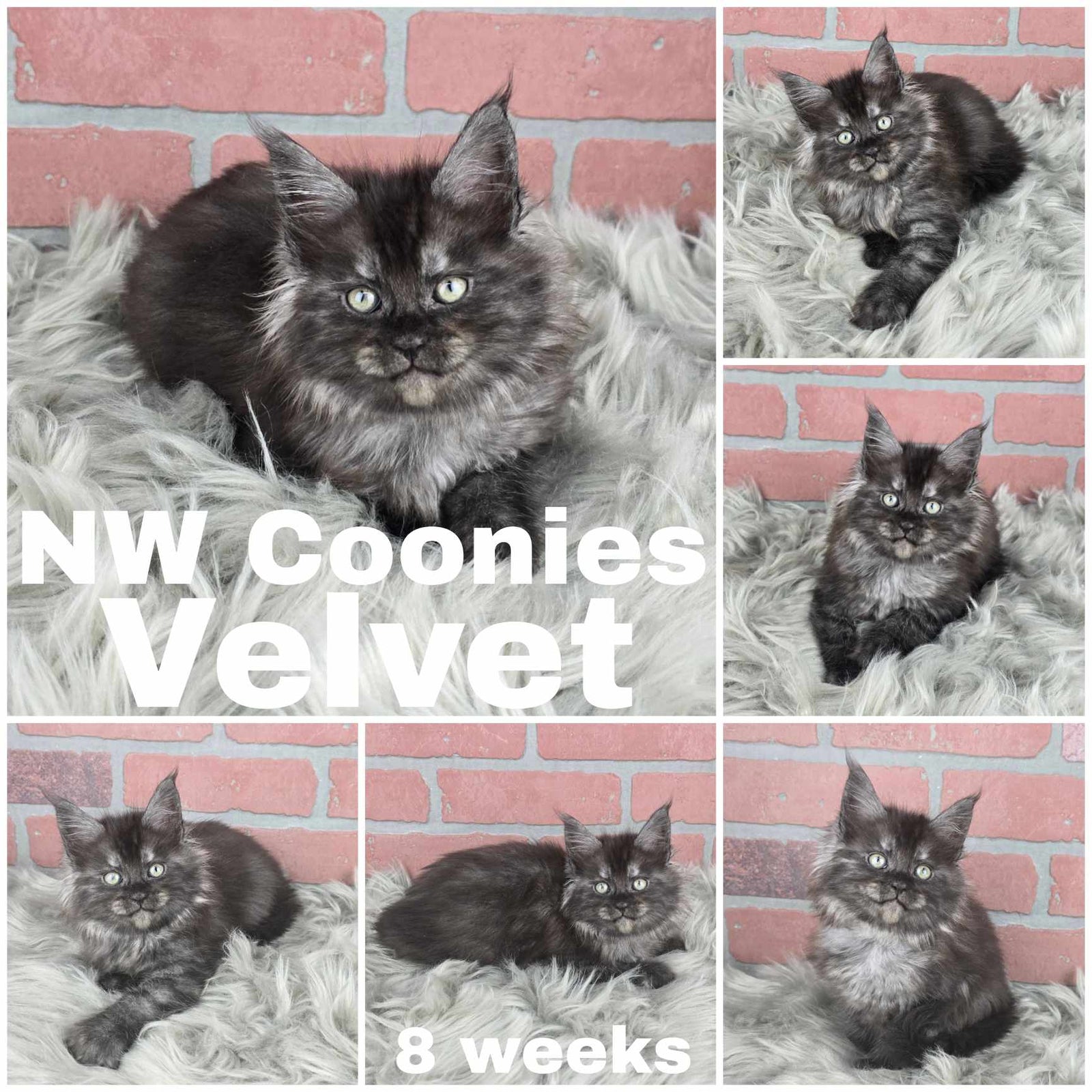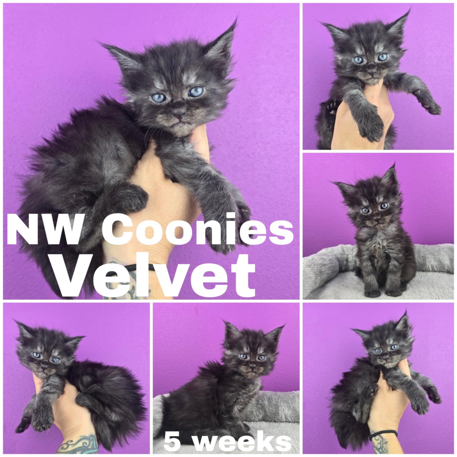 Queen Velvet was born in our cattery on July 10th, 2024. She's a black smoke. Her papered name is NW Coonies Velvet. Her sister/littermate is NW Coonies Poppy.