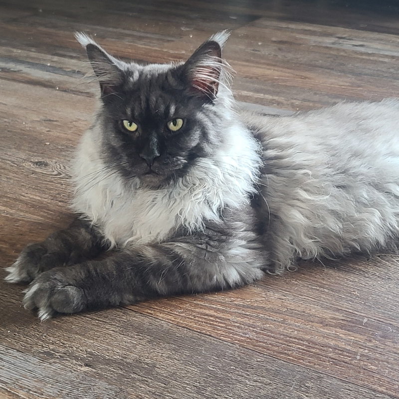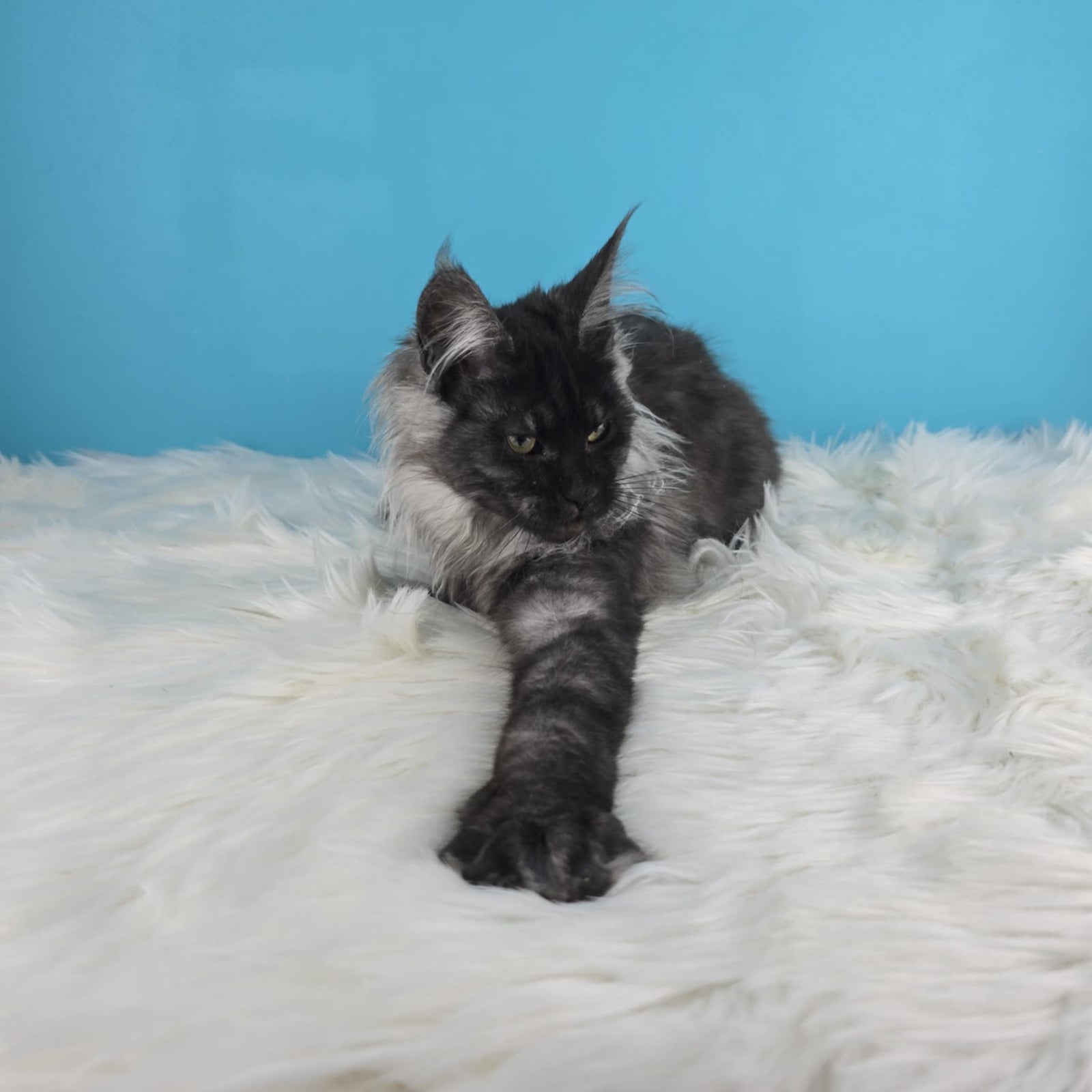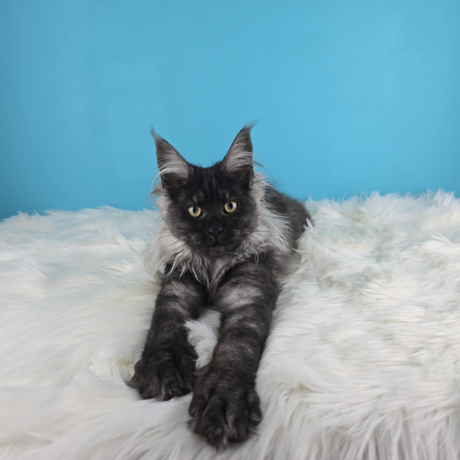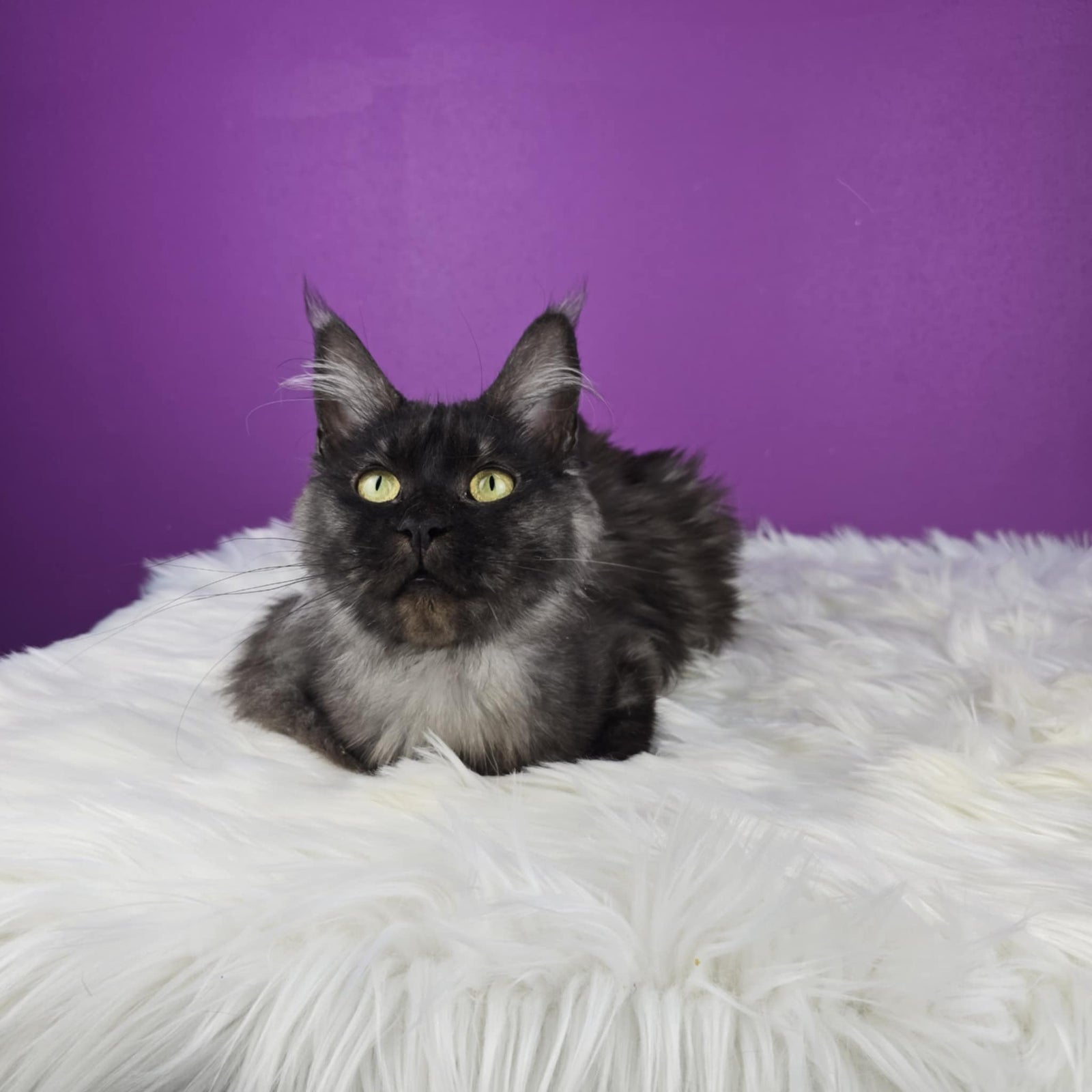 Queen Velvet was born in our cattery on July 10th, 2024. She's a black smoke. Her papered name is NW Coonies Velvet. Her sister/littermate is NW Coonies Poppy.
